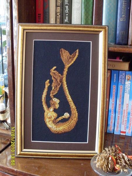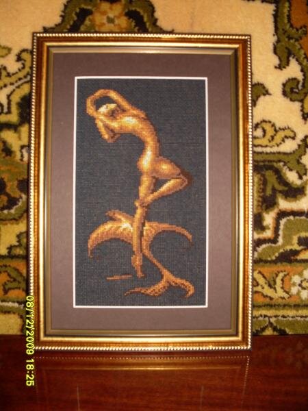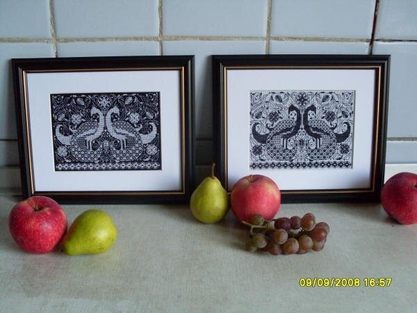 Работа очень сложная. Используется крестик, бэкстич и монохромная вышивка. Если кому интересно, эта схемка из журнала Вышиваю крестиком №4 Апрель 2009 г. К сожалению, журнала у меня в электронном виде нет. Очень было тяжело вышивать на черной канве, особенно монохромно, но результат того стоил. Оформляла в багетке. Картины пошли на подарок маменой подруги - как раз подошли под интерьер гостинной.