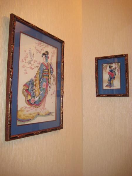 Обожаю Dimensions. Есть хорошая подруга, которая дарит то, что нравится, и при этом ухитряется сделать сюрприз :) Подарила она мне на ДР (лет 5 уже теперь назад :)) набор "Восточная элегантность" (большая гейша), "Ковыряла" я ее долго.... 2года (первая большая работа с идеальной изнанкой), но дошила. Ну, а маленькую, как пару сама купила, да и вышила быстро :) Теперь висят в коридоре и радуют при каждом переходе из комнаты в комнату :)